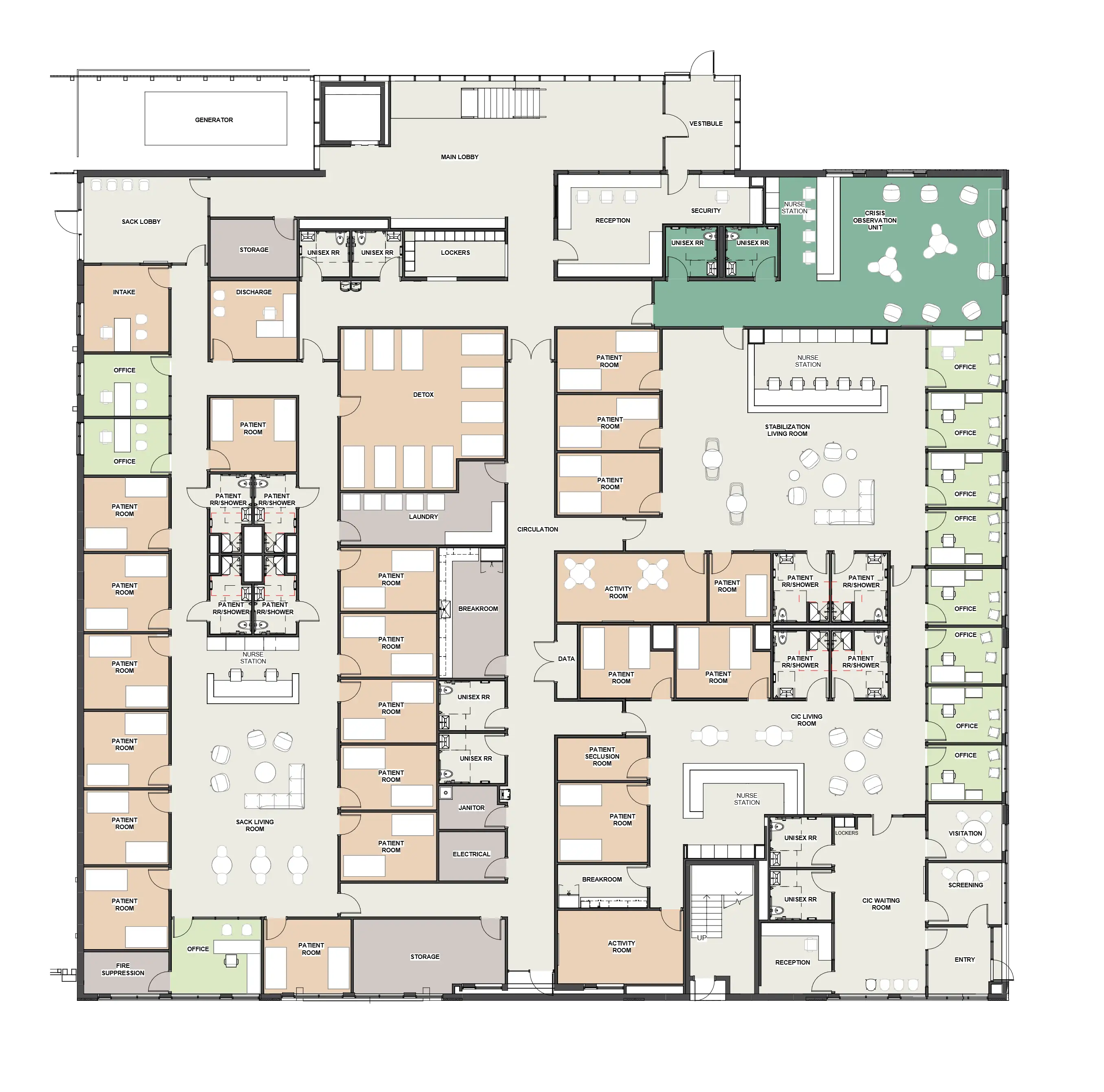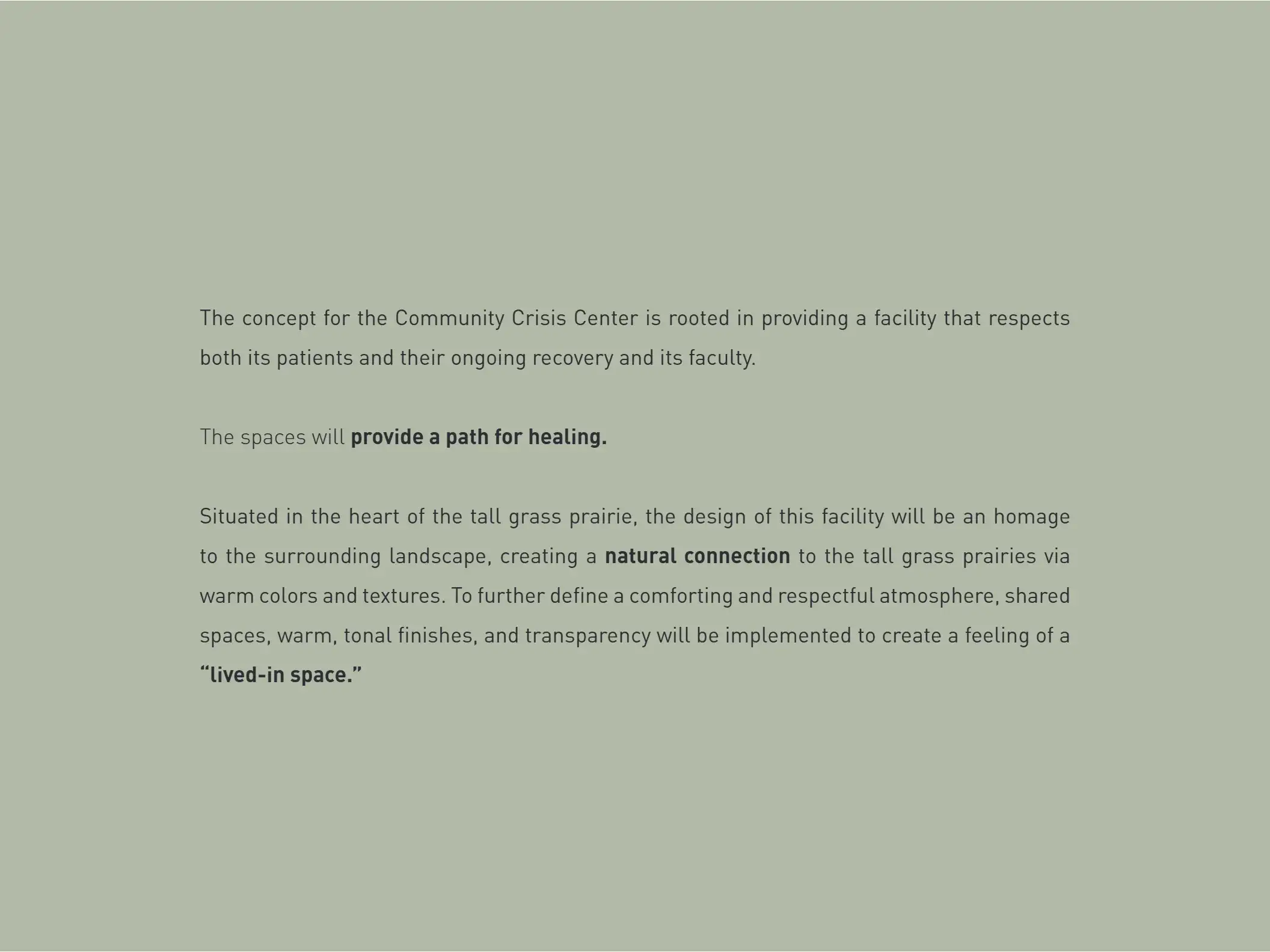 The COMCARE Community Crisis Center project focuses on the interior renovation and planning of a specialized healthcare and support facility designed to serve individuals experiencing behavioral health crises. The scope includes intake areas, counseling and assessment spaces, staff work zones, and support functions, all carefully designed to prioritize safety, dignity, and trauma-informed care. The in-progress project emphasizes calming materials, clear circulation, and functional layouts that support both patients and staff, creating a welcoming, secure environment that enhances the delivery of critical community services.
