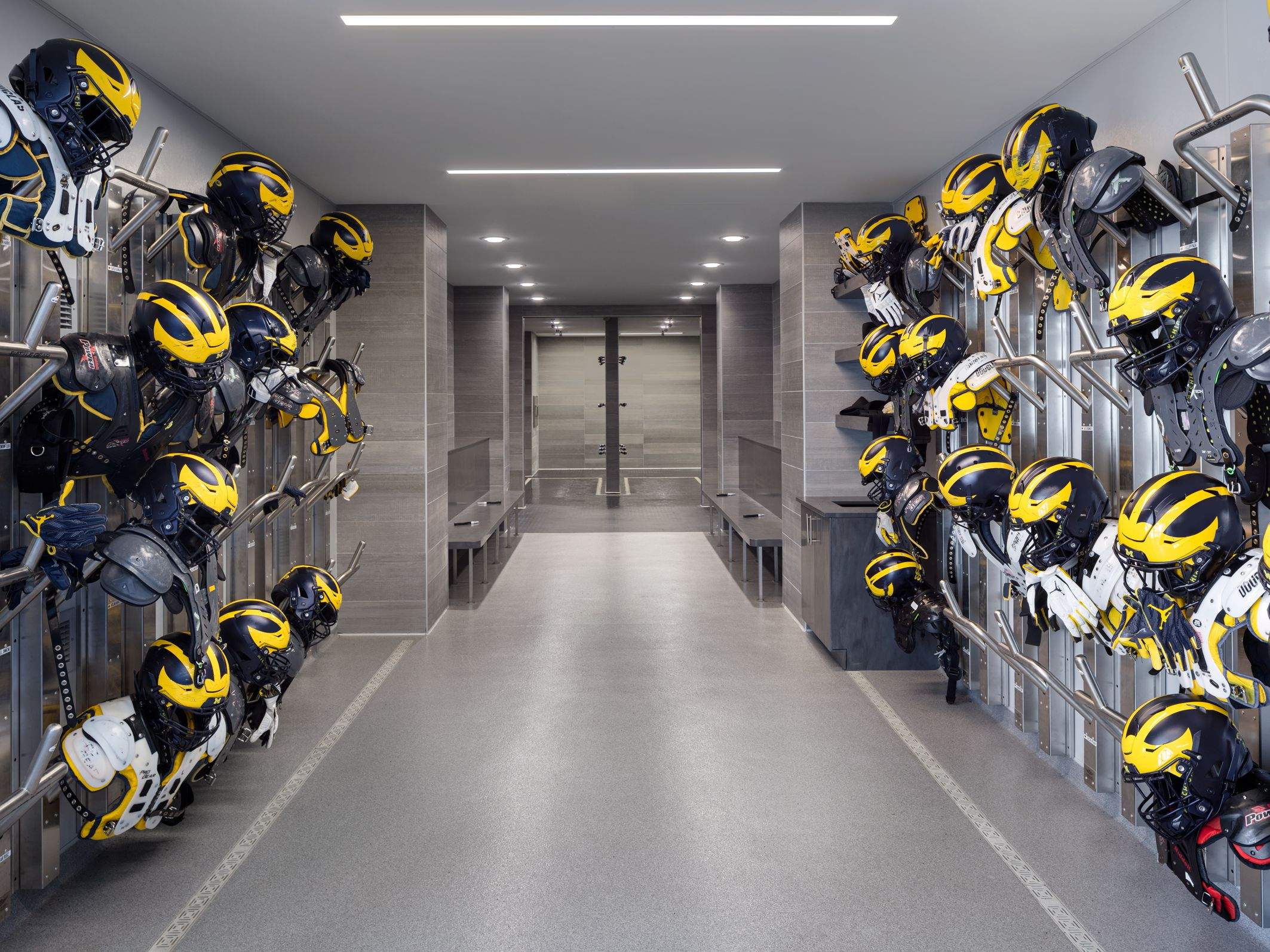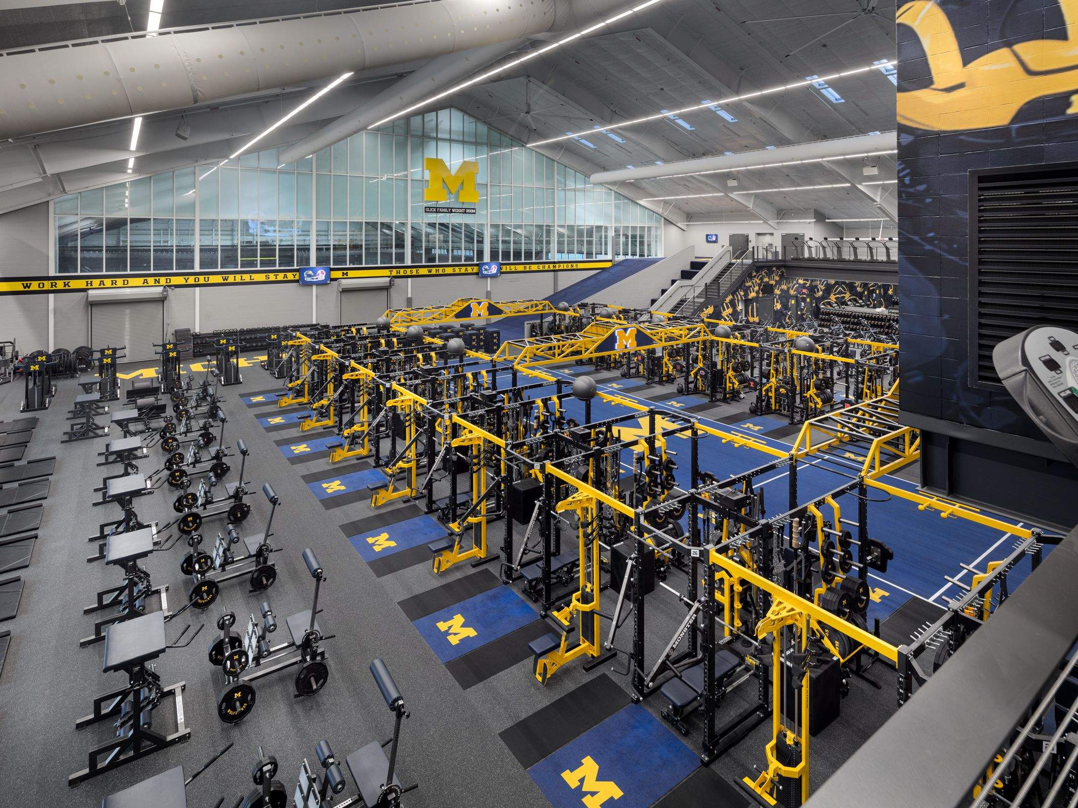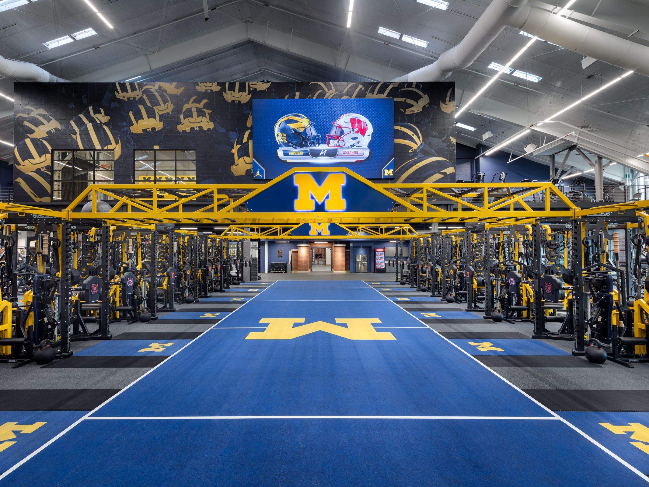 The renovation and expansion of Schembechler Hall transformed the University of Michigan Football Performance Center into a comprehensive, high-performance training environment. The project introduced a 33,000-square-foot strength and conditioning facility featuring a state-of-the-art weight room and plyometric training hill, alongside upgraded sports medicine and recovery spaces. New hydrotherapy and cryotherapy areas support athlete wellness, while an integrated nutrition zone, expanded equipment areas, and modernized team meeting and position rooms enhance daily operations. Together, the improvements create a holistic performance hub designed to support training, recovery, and collaboration at the highest collegiate level.
